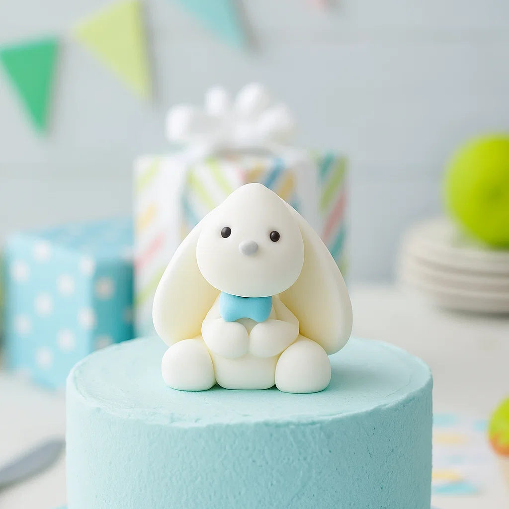 En liten kanin med blå rosett gör tårtan både söt och minnesvärd. Denna sockerpastafigur är perfekt till babyshower, dop eller födelsedagsfirande och förvandlar snabbt en enkel tårta till en sagolik dekoration. Med sina mjuka former och charmiga uttryck blir den ett gulligt blickfång på varje dessertbord. Figuren är ätbar och färdig att placera direkt på tårtan – men många väljer också att spara den som ett litet minne från den speciella dagen. En tårtdekoration som sprider både glädje och kärlek.