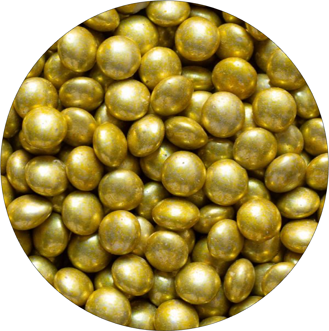 Vackert strössel i glänsande guld! Under den vackra finishen döljer sig len och fyllig mjölkchoklad, gjord på hela 60 % chokladmassa. Det gör att strösslet är lika gott att äta som det är vackert att dekorera med. Med sin generösa storlek på ca 10 mm blir varje chokladlins en liten del av ett större, guldskimrande konstverk. Använd dem direkt på bakverk eller strö dem som konfetti över festdukningen – resultatet blir alltid lika sagolikt.