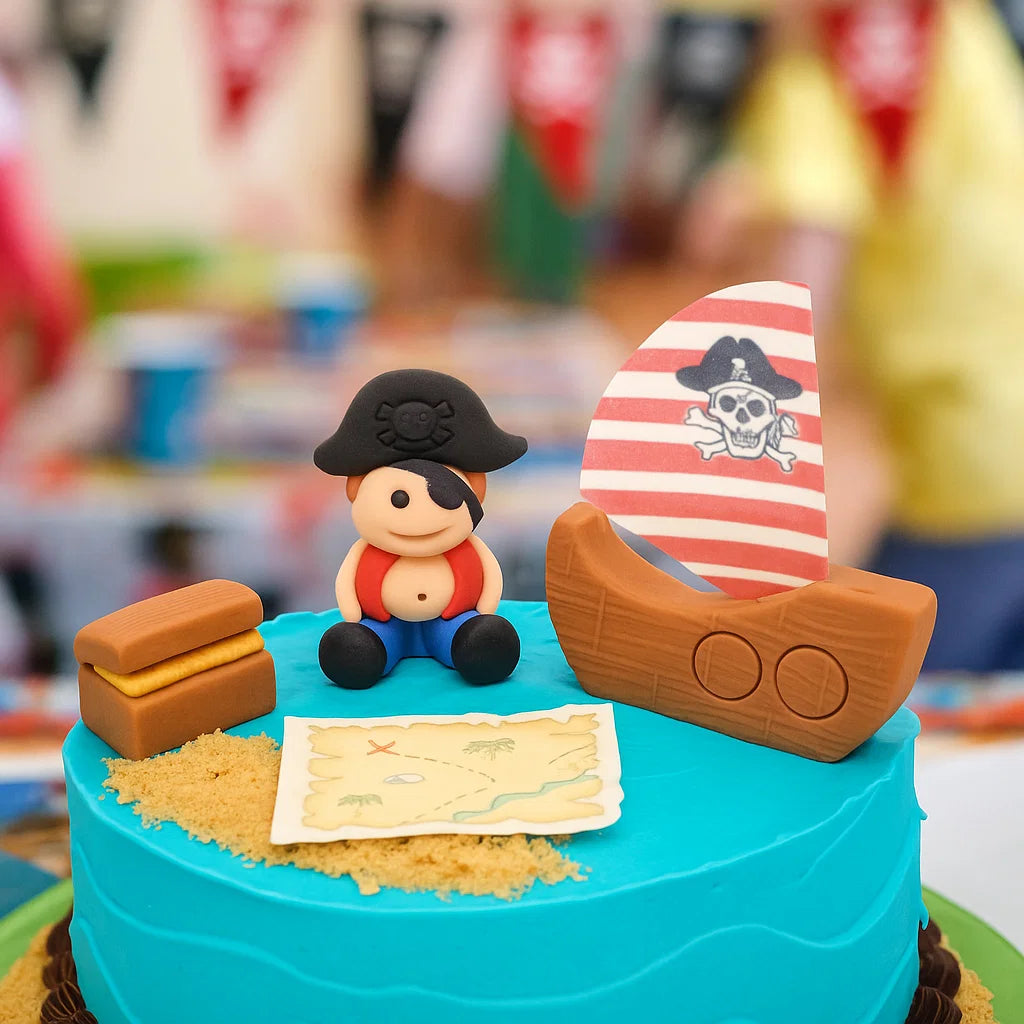Skapa ett riktigt äventyr på tårtan med detta underbara piratset i sockerpasta och waferpapper! Här får du en liten pirat, ett skepp med segel, en skattkista och en skattkarta – allt fullt ätbart och redo att göra piratkalaset oförglömligt. Perfekt för barnkalas, temafester eller när du vill överraska med en tårta som bjuder på både lekfullhet och fantasi. Låt gästerna följa skattkartan till en tårta fylld med skatter!