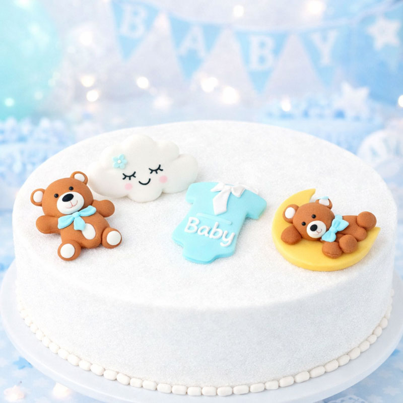 Med nallar, moln, bebisbody och en drömsk måne blir det enkelt att bygga en berättelse på tårtan – perfekt för att fira ett nytt liv. Dekorationerna passar lika fint på cupcakes som på större tårtor och gör bakverket personligt, genomtänkt och alldeles oemotståndligt.